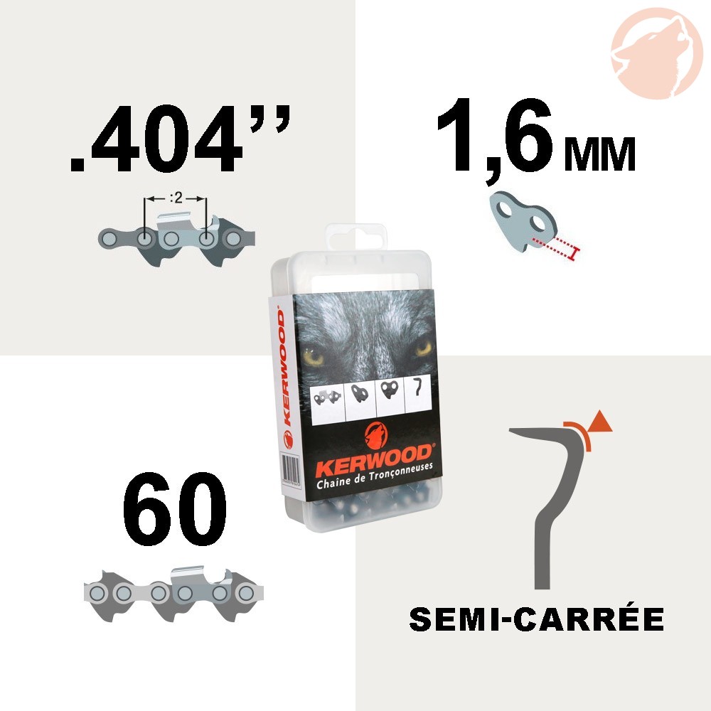 Chaîne de tronçonneuse - 0.404" - 1,6mm - 60 maillons - semi carrée - KERWOOD