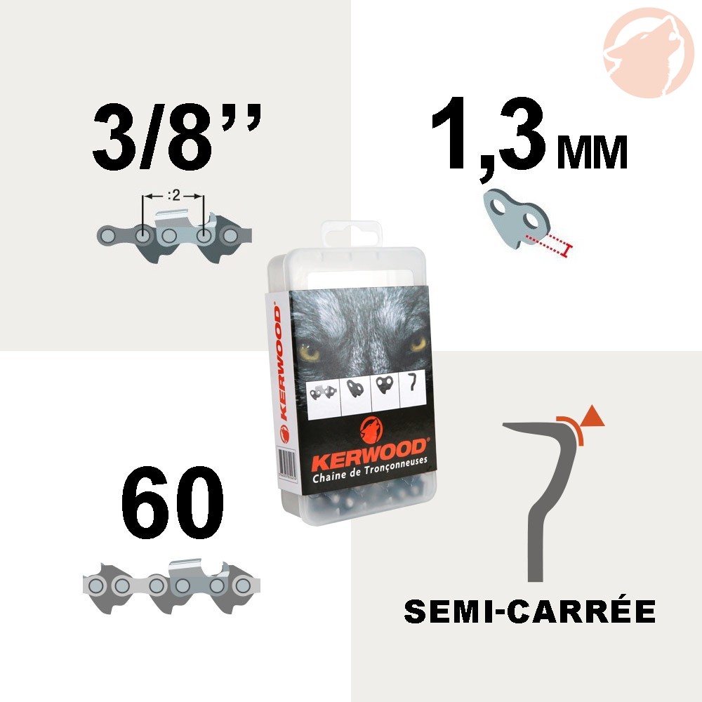 Chaîne de tronçonneuse - 3/8" - 1,3mm - 60 maillons - semi carrée - KERWOOD